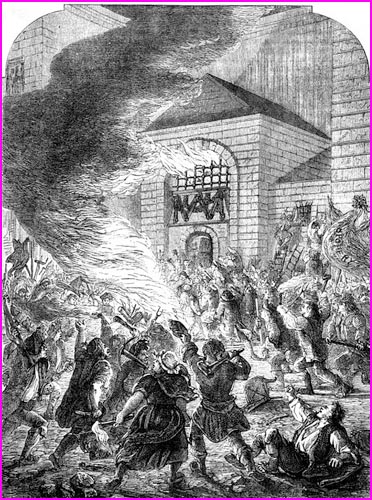 Determination, ferocity and carnivalesque glee from massed rioters in June 1780, as London’s notorious Newgate Prison burns and prisoners are rescued: as imagined by Victorian artist: Wikimedia Commons