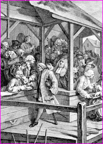 Detail from William Hogarth’s The Polling (1754 – 5), showing open voting in action, as a wounded soldier of modest means approaches the clerk to cast his vote, whilst lawyers argue – as part of a peaceful, if at times rumbustious test of public opinion.