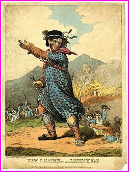 Their legendary leader was one Ned Ludd, seemingly named after a framebreaker in 1779; he was depicted as an outlaw figure, sometimes lightly disguised as a woman; as shown in a famous engraving (1812) entitled