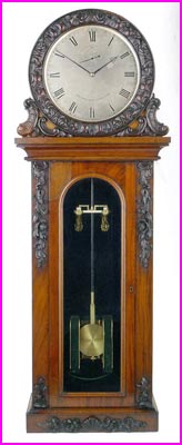 An early electromagnetic clock by Alexander Bain (1810 – 77), dating from the 1840s. The longcase glass-fronted housing reveals the working of the electromagnetic pendulum, reassuringly combining new technology with old familiar formats. Source: https://en.wikipedia.org/