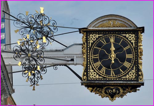Guildford Town Clock, made by London clockmaker John Aylward, and projecting from Guildford Town Hall since 1683.