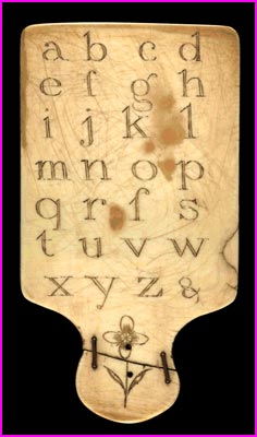 English Eighteenth-Century Ivory Hornbook, devised as a memory-aid for children, with the alphabet in upper-case letters on one side and (shown here) lower-case letters on the reverse. Note that the list includes the elongated version of lower-case ‘S’, as well as the compact ‘s’ which was rapidly becoming standard. © original in US Library of Congress No = 2007700155