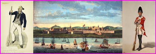 Supports for British Power Overseas: (L) drawing of Petty Officer in Royal Navy (c.1799); (Centre) the British East India Company’s trading toe-hold at Fort St George on Coromandel Coast, Madras, India, as depicted by Jan van Ryne (1712 – 60); (R) Grenadier Guard in the British Army (c.1799).